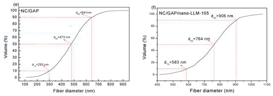 Images and diameter distributions of samples: (a) for NC/GAP; (b) for NC/GAP/nano-LLM-105; (c–f) the diameter distribution.