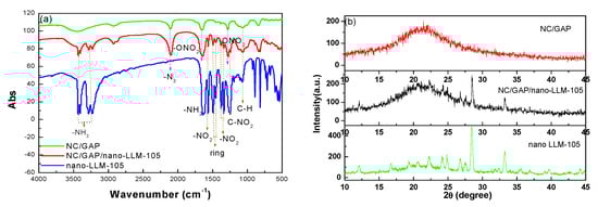IR spectra (a) and XRD patterns (b) of NC/GAP, nano-LLM-105 and NC/GAP/nano-LLM-105.