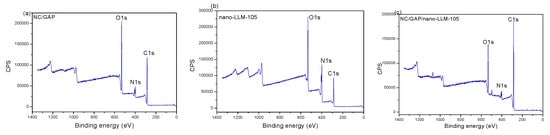 The XPS spectra of NC/GAP, nano-LLM-105, and NC/GAP/nano-LLM-105 are displayed in Figure 6. From Figure 6a–c, typical signals of C, N, and O were clearly detected. For NC/GAP/nano-LLM-105, the O1s spectra presented five features with binding energies of 531.3 eV, 532.3 eV, 533.1 eV, 534.2 eV, and 534.8 eV; the peaks at 532.3 eV and 534.8 eV were ascribed to -NO2 and N-O in the ring of LLM-105; the peaks at 533.1 eV and 534.2 eV belonged to -O*-NO2 and -O-NO*2 in NC; the peak at 531.3 eV was related to the -C-O-C group of NC and GAP [31]. For the C1s spectrum of NC/GAP/nano-LLM-105, the peak was fitted to six peaks. The peaks located at 284.5 eV, 286.3 eV, and 288.2 eV were assigned to -C-C, C-N3, and -C-ONO2 of GAP and NC. The peaks at 284.7 eV, 286.8 eV, and 287.6 eV corresponded to -C-C, -C-NH2, and -C-NO2 in nano-LLM-105 [32]. The XPS spectrum of N1s consisted of seven peaks at 400.4 eV, 401.1 eV, 404.1 eV, 404.2 eV, 406.9 eV, 407.7 eV, and 408.2 eV, which corresponded respectively to –N=N=N, –NH2, –N=N=N, C-N in ring, -NO2, –ONO2, and N-O in the ring [28]. The -N3 and –ONO2 groups were ascribed to NC and GAP, respectively. Finally, the groups of C-N in ring, N-O in ring, –NH2 and -NO2 belong to LLM-105. Hence, we infer the existence of LLM-105 nanoparticles on the surface of NC/GAP, and there are no new chemical bonds being produced on the surface of the nanofibers.