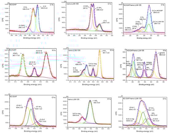 (a–c) XPS spectra of NC/GAP, nano-LLM-105 and NC/GAP/nano-LLM-105; high resolution XPS spectra (d–f) for C 1s of samples; for (g–i) N 1s of samples and for (j–l) O 1s of samples.