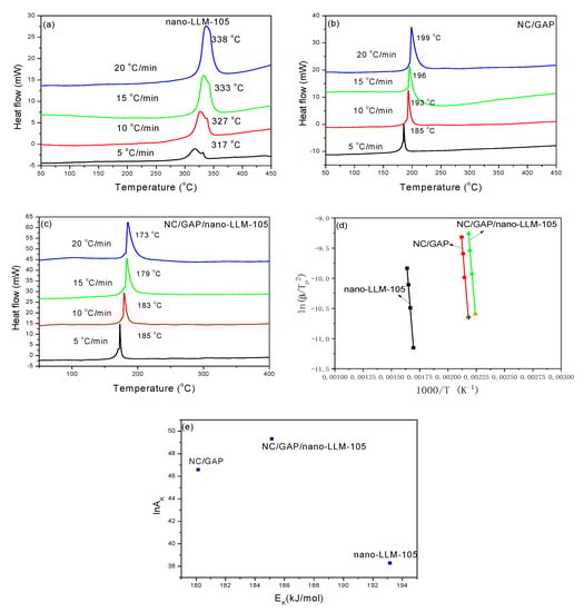The DSC thermograms of samples collected at different heating rates are displayed in Figure 8a–c. The kinetic and thermodynamic parameters for thermal decomposition are calculated with the DSC data; the results are displayed in Table 3. For all samples, the exothermic peak temperature increases with the increase of heating rate. For NC/GAP/nano-LLM-105, there was only one exothermic peak, demonstrating that NC, GAP, and nano-LLM-105 decompose synchronously. In addition, the exothermic peak temperature of NC/GAP/nano-LLM-105 is slightly lower than that of NC/GAP, and it is markedly lower than those of the LLM-105 nanoparticles. This manifests that the thermolysis of NC, LLM-105 nanoparticles, and GAP cooperate with each other.