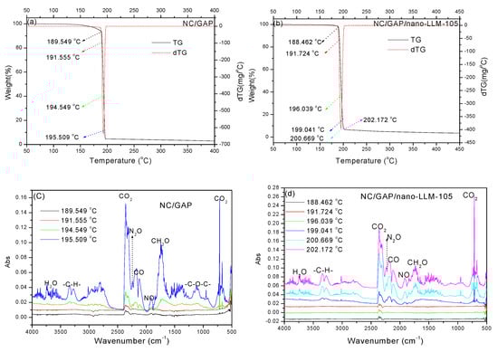 The products for the thermal decomposition of NC/GAP/nano-LLM-105 and NC/GAP were investigated by TG-IR. The TG and DTG curves are displayed in Figure 9a,b, and the IR spectra at different temperatures are shown in Figure 9c,d. For NC/GAP, the decomposition began at 177 °C, and the decomposition rate reached its maximum at 193.11 °C. The decomposition almost finished at 196.6 °C. For NC/GAP/nano-LLM-105, the initial decomposition temperature rose to 188.65 °C. Composite nanofibers decomposed at the fastest rate at 195.07 °C. Also, the decomposition was generally accomplished at 201.04 °C. This means that the decomposition of NC/GAP/nano-LLM-105 is more concentrated. The IR spectrum, indicated that the main products were diverse. The main peaks and attributions are listed in Table 4. For clarity, the curves are vertically offset in Figure 9c,d. The strong peaks at 2309–2360 cm−1 indicated the presence of much CO2 gas. The peaks in 2113–2199 cm−1 represented the appearance of CO. The weak peak located at 2239 cm−1 manifested the existence of a very low amount of N2O gas. The existence of NO explicates the peaks that were located at 1901–1924 cm−1. Moreover, the peaks in 3271–3379 cm−1 and 1691–1788 cm−1 corresponded to the fragments of -CH and -CH2O, respectively. The –N3 is the energetic group of GAP, which is decomposed to N2. In reality, N2 is a nonpolar molecule, and it cannot be probed by IR. For those two nanofibers, the positions of the main peaks are mainly identical. The only difference is the generation of -C-O-C- fragments for NC/GAP nanofibers. However, there are no -C-O-C- fragments for NC/GAP/nano-LLM-105. In addition, compared with NC/GAP, the peak intensities of the-CH2O fragments decreased significantly. This indicates that for NC/GAP/nano-LLM-105, the fragments of -CH2O and -C-O-C- further reacted to generate CO2, CO, and H2O. This is because the interposition of the LLM-105 nanoparticles in NC/GAP improved the oxygen balance.