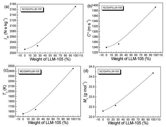 Energy performances of NC/GAP/LLM-105 nanofibers as a function of the weight percentage of LLM-105: (a) for Isp; (b) for C*; (c) for Tc and (d) for Mc.