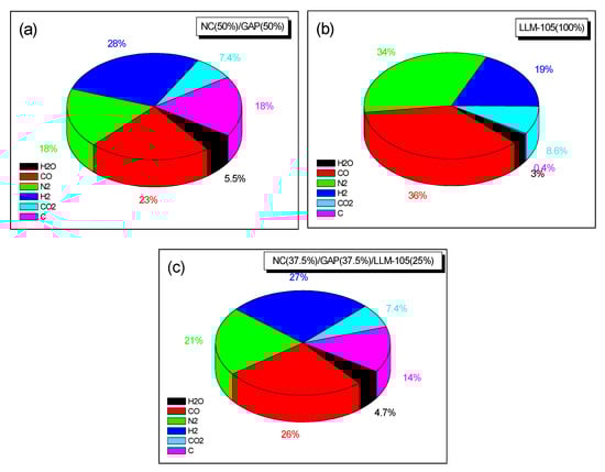 (a–c) Combustion products and their molar ratios for NC/GAP/LLM-105 nanofibers. The results in Figure 11 were calculated by the means of the ProPep 3.0 software under conditions of Pc/Pe = 70/1 (Pe = 0.1 MPa) and T0 = 298 K.