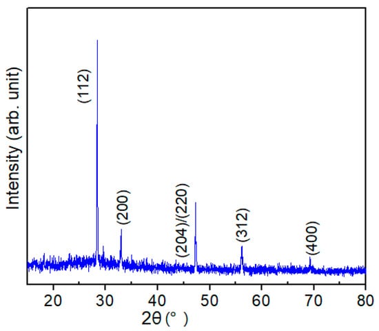 To eliminate the influence of Mo on the spectra, the CZTS film was fabricated on the soda-lime glass (SLG) substrate using the method mentioned in the experimental approach (above) to carry out the XRD measurement. Figure 1 shows a representative XRD pattern of the as-grown CZTS film. In the precursor, only the main peak of kesterite CZTS can be detected [13,14] and no other expected phases, such as ternary Cu-Sn-S phases or binary Cu-S, Zn-S or Sn-S phases, are observed. The film showed a strong (112)-oriented peak, which is common in kesterite CZTS films. The result can be explained in two ways: (1) the CZTS film bulk only contains a CZTS phase and no other phases exist, thus, only peaks of the pure CZTS phase can be observed; (2) other impurity phases also exist in small amounts but are undetectable by XRD measurement or covered by the background noise. To clarify the distribution of the secondary phases, further measurement must be conducted.