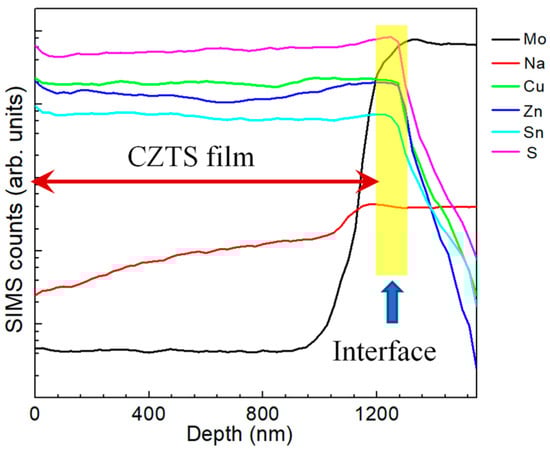 Depth profiles of elements in a CZTS film by secondary ion mass spectroscopy (SIMS) characterization for Mo, Na, Cu, Zn, Sn and S.