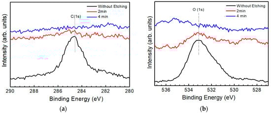 X-ray photoelectron spectroscopy (XPS) spectra of (a) carbon and (b) oxygen measured at different depths from a CZTS thin film: surface (without etching), 10 nm (2 min), 20 nm (4 min). The spectrum of C was used as the reference and all the peaks were rectified according to the peak of C at a binding energy of 284.6 eV.