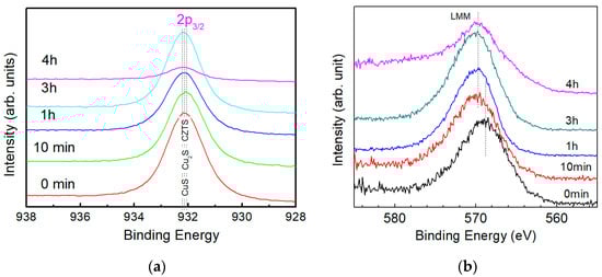 For the following sections, samples after surface cleaning to remove oxygen, as explained in the previous section, are defined as initial state of the sample; that is, ‘etching time 0 min.’ Figure 4a shows the XPS spectra for Cu 2p3/2 in the CZTS film with etching times of 0 min (without etching), 10 min (50 nm), 1 h (300 nm), 3 h (900 nm) and 4 h (1.2 μm). A single peak around 932.2 eV was observed for all samples and with an increase in etching time, the peak shifted slightly toward a higher binding energy. When the etching time is less than 3 hours, XPS spectra show strong peaks indicating a large amount of Cu compounds. When the sample is etched for 4 hours, the peaking intensity decreases dramatically, which is used to determine the back surface of the CZTS film. During the annealing process for CZTS, secondary phases form easily because of the decomposition of the CZTS films [16]. It is reported that the binding energies of Cu 2p3/2 for possible Cu compounds in CZTS film are 932.6 eV for Cu2S, 932.5 eV for CuS and 932.2 eV for CZTS [17] and the binding energies of different chemical states are illustrated in Figure 4a. However, it is difficult to determine the chemical state in the film by XPS spectra (as shown in Figure 4a) because of small differences in the binding energies for different compounds. Therefore, Auger spectra of Cu LMM is also acquired with the same CZTS film used to conduct XPS spectra, as shown in Figure 4b.