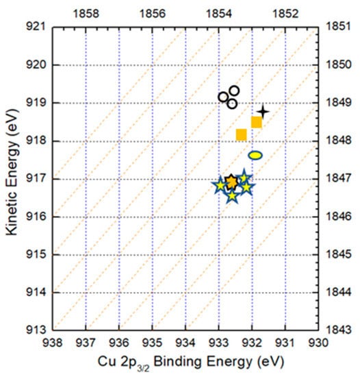 where BE(Cu 2p3/2) is the peak energy of Cu 2p3/2 in the XPS spectra, hυ is the X-ray energy of Al Kα (1486.6 eV) and E(A-Cu LMM) is the peak position of the Auger spectra of Cu LMM.