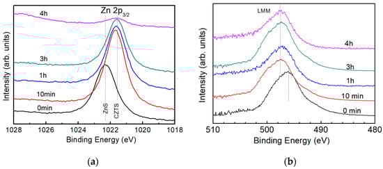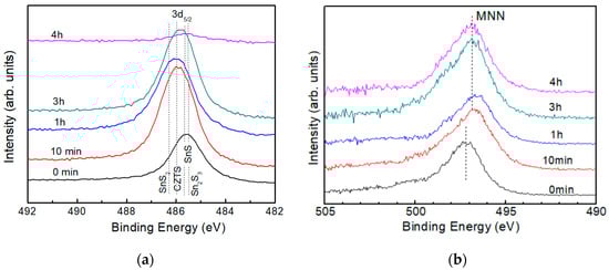 Figure 8a shows the XPS spectra for Sn3d3/2 in a CZTS film with different etching times. Dashed lines indicate the peak positions of possible SnS compounds in CZTS films. Binding energies of 485.8, 485.5, 486.5 and 486.3 eV correspond to Sn2S3, SnS, SnS2 and CZTS [28,29], respectively. Although identification of the chemical state in the film is difficult because of the small differences between the binding energies of different peaks, it is clear that chemical states at the surface and in the bulk of CZTS are different. The XPS spectra show a main peak around 485.8 eV at the surface and peaks around 486.0 eV under the surface. Therefore, it is inferred that the surface of the CZTS bulk is covered by a thin layer of an SnS compound. To further confirm our conclusion, Auger electron spectra was acquired, as shown in Figure 8b.