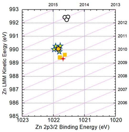 An Auger parameter cancels the influences of electrical charging at the surface and combines the effects of XPS and AES analysis. Thus, it is effective for separating peaks with similar binding energies in the XPS spectra. Calculation of an Auger parameter is shown in Equation (1) [18].