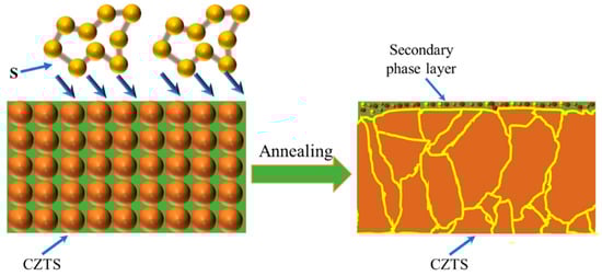 Figure 10 shows a schematic of the growth process of a CZTS film. During annealing, the grain size of the CZTS film gradually grows and secondary phases precipitate on the surface of the film. The total thickness of the secondary phase layer is several tens of nanometers and consists of CuS, ZnS and SnS compounds.