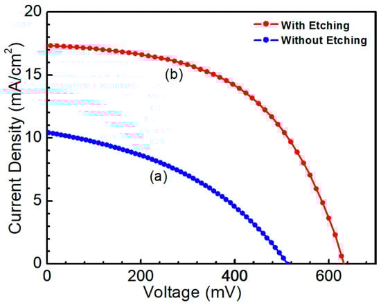 where, q is the elementary charge, QE is quantum efficiency and bs is solar flux or irradiation. For air mass 1.5, the data are available from Ref. [35]. Based on Equation (5), Figure 12 and the solar irradiation spectrum, Jsc, of the CZTS solar cell was calculated as 8.4 mA/cm2 for a CZTS solar cell without etching and 15.5 mA/cm2 for a solar cell with etching. Because the J-V curve represents the real performance of a photovoltaic device, the slight deviation of Jsc calculated from the QE curve can be explained as follows: the QE measurement is carried out at a single wavelength with much lower intensity than that of a one sun irradiation.