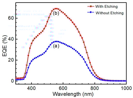 Figure 12 shows the external quantum efficiency (EQE) curve of the CZTS solar cell. After etching, the QE was significantly improved, as shown in the figure. The QE curve exhibits an abrupt drop in the infrared region around 770 nm, which was the CZTS absorption edge. Thus, the calculated bandgap of the CZTS films was about 1.61 eV. The features near 510 and 380 nm corresponded to the absorption edges of the CdS and ZnO layers [33], respectively, which was common when using the respective CdS buffer and ZnO window layers. Based on the EQE data of a solar cell, Jsc was calculated as [34]: