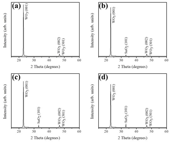 Oxides in a one-dimensional architecture have the advantage of high sensitivity and fast response/recovery speed due to their high surface-to-volume ratio and great surface activity compared to bulk or thin-film form [7,8,9]. Therefore, the application of one-dimensional WO3 nanostructures is one of the main strategies for increasing their gas-sensing performances. Many methods such as hydrothermal and electrospinning techniques have been proposed to fabricate one-dimensional WO3 nanostructures [10,11,12]. The hydrothermal synthesis of one-dimensional WO3 nanostructures yields a large amount of WO3 nanostructures from a solution at process temperatures lower than 250 °C. This method has the advantages of large-scale amount fabrication, low process cost, and easy process parameter control; therefore, hydrothermal methods are promising for synthesizing one-dimensional WO3 crystals for gas-sensing applications. Recently, an improved gas-sensing ability of nanostructured WO3 was achieved through heterostructure engineering. The intrinsic gas-sensing abilities of nanostructured WO3 toward various target gases can be substantially enhanced through the coupling with other semiconductor oxides. For example, microwave synthesized Fe2O3-decorated WO3 nanostructures exhibit improved H2S gas-sensing performance [13]. Electrospinning method-derived NiO particles functionalized with WO3 porous composites demonstrate enhanced acetone gas-sensing responses [11]. WO3 nanosheets loaded with SnO2 nanoparticles exhibit enhanced methane-sensing performance. Moreover, it has been shown that the loading content of SnO2 nanoparticles has an important influence on the sensing behavior of WO3–SnO2 nanocomposites [6].