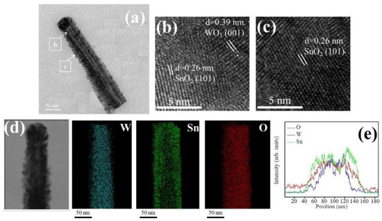 (a) Low magnification transmission electron microscopy (TEM) image of a WS-1 nanorod. (b,c) High-resolution TEM (HRTEM) images of the nanorod taken from different regions. (d) W, Sn, and O elemental mapping images of the nanorod. (e) Elemental line-scanning profiles across the nanorod.