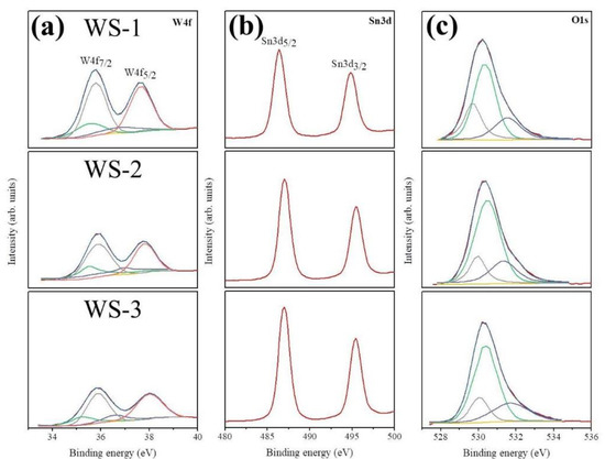 The peak intensity of W4f core-level doublets originating from the WO3 nanorods decreased and the peak intensity of the Sn 3d core-level doublets of the sputtered SnO2 coverage layers increased with the increase of the sputtering duration of SnO2 in Figure 6a,b. This reveals that the variation of the SnO2 shell layer thickness on the composite nanorods is controlled by the change in the sputtering duration of the SnO2 thin films. Figure 6a displays the W4f7/2 and W4f5/2 peaks centered at 35.9 and 37.9 eV, respectively, for the WO3 nanorods coated with various thicknesses of SnO2 thin films. The Gaussian deconvolution results of the W4f spectra of the various composite nanorods illustrated the contributions corresponding to the W5+ and W6+ states in the WO3. The main peaks centered at 35.9 and 37.9 eV correspond to W6+ binding states; moreover, the weaker intensity and lower binding energies for the subpeaks centered at 35.2 and 36.5 eV correspond to W5+ binding states. Figure 6b displays XPS Sn3d spectra of various WO3–SnO2 composite nanorods. A correspondence Sn3d5/2 peak centered at 487.1 eV and a Sn3d3/2 peak centered at approximately 495.4 eV were observed. The binding energy difference between the Sn3d5/2 and Sn3d3/2 corresponded to the chemical binding component of Sn4+ in the SnO2 [15,17]. The O1s XPS spectra of various composite nanorods in Figure 6c demonstrated three subcomponents. The component with a binding energy of approximately 529.8 eV is assigned to the tungsten oxide that formed the W–O bonds [19]. The second component with a binding energy of 530.5 eV is assigned to the tin oxide that formed the strong Sn–O bonds [15,17], and the small degree of oxygen vacancies and/or oxygen species chemisorbed from the ambient air were demonstrated in the component centered at approximately 531.9 eV.