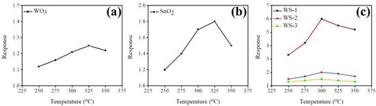 Temperature-dependent gas-sensing responses for the gas sensors on exposure to 100 ppm acetone vapor at operating temperatures ranging from 250 to 350 °C: (a) WO3 nanorods, (b) SnO2 thin film, (c) various composite nanorods: WS-1 (red line), WS-2 (blue line), and WS-3 (yellow line).