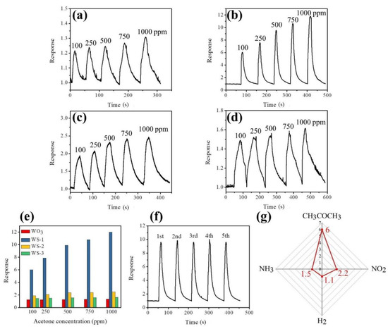Dynamic gas-sensing response–recovery curves of various nanorods upon exposure to different acetone vapor concentrations (100 to 1000 ppm): (a) WO3, (b) WS-1, (c) WS-2, and (d) WS-3 nanorods. (e) Gas-sensing response values vs. acetone vapor concentration for various nanorods. (f) Cyclic gas-sensing response curves for the WS-1 nanorods exposed to 500 ppm acetone vapor. (g) Gas-sensing selectivity of the WS-1 nanorods exposed to 100 ppm of CH3COCH3, NH3, and H2, and 5 ppm of NO2.