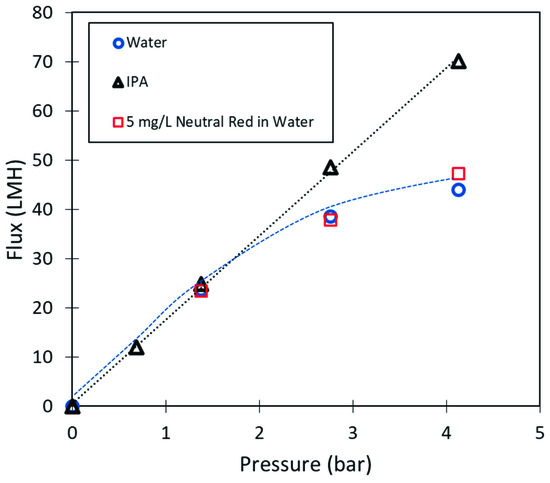 Flux (LMH, liter/m2-bar) vs. pressure (bar) behavior for iron cellulose composite membranes in water, isopropanol (IPA), and neutral red in water.