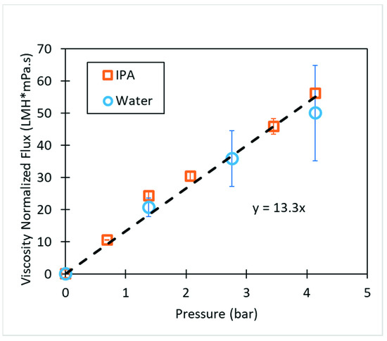 Further investigation of pressure dependent isopropanol flux gave unexpected results. Despite the viscosity of IPA being roughly double that of water, the permeability remains the same. Isopropanol permeability had previously been studied in cellulose membranes as seen in Figure 3 to observe the effect of the polar solvent on membrane stability. When corrected for viscosity, isopropanol and water flux behavior follow the same linear trend. This strongly suggests the membrane surface does not swell when in contact with isopropanol. IPA flux was higher than what would be expected when observing water permeability. This suggests that the membrane becomes more permeable when exposed to isopropanol.