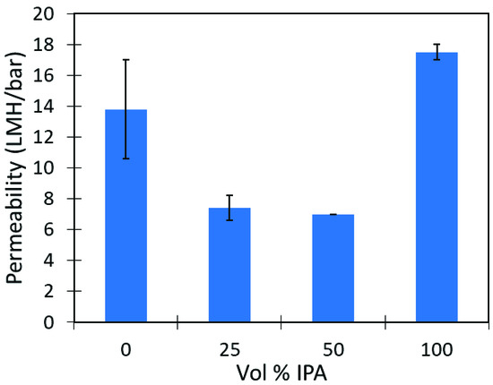 Interestingly, water permeability was decreased at solvent mixtures of 25:75 and 50:50 isopropanol:water as compared to either pure water or pure isopropanol. The permeability at different solvent concentrations can be seen in Figure 4. Strong water interaction within the cellulose domain may provide a barrier for isopropanol diffusion into the membrane domain. Mao et al. has observed that flux through cellulose membranes declined as isopropanol concentration increased during pervaporation operation [9]. Membrane permeability increased for pure isopropanol solvent, as iron is unable to be ionized after the 100% isopropanol solution removes residual water in the membrane. Absence of Fe3+ ions decreases interaction between cellulose chains, which may be responsible for the higher permeability in pure solvent conditions. When the membrane is rehydrated, more ionization of iron particles to Fe3+ occurs and the selective layer becomes denser. This behavior could be of great interest for applications of membrane cleaning or desorption of contaminants from the membrane surface.