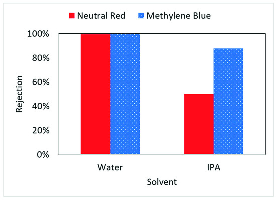 Neutral red (~289 Da) and methylene blue (~320 Da) were completely rejected (>99%) during filtration through the membrane using DI water as a solvent. As seen in Figure 5 rejection decreased in isopropanol which is to be expected due as hydrophilic interaction decreases in isopropanol. The increase of membrane permeability suggests the dense selective layer becomes more permeable.