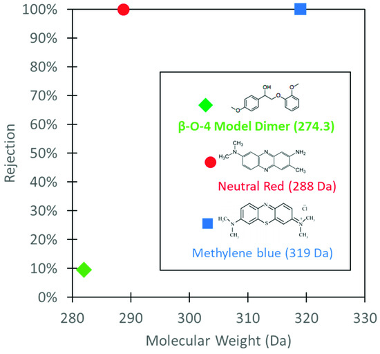 Rejection studies with model dyes also suggests other factors contribute to solute selectivity other than size exclusion. Selectivity vs. molecular weight for small model molecules is show in Figure 6. Rejection of β-O-4 Model Dimer was only 10% despite the MW only being 7 Da less than neutral red. The disparity in rejection can be attributed to interaction among the hydrophilic functional groups. The positive dipoles of the amine groups in the dyes interacts more strongly with negative dipoles of hydroxy groups in cellulose reducing rate of diffusion of the dyes through the membrane. Carboxyl groups in the model dimer do not react as strongly. Rotational freedom in the model dimer may also allow for the dimer to change confirmation as it moves through the membrane, thus increasing diffusion rate. Ring structures in the model dyes prevent rotation within dyes as they move into the membrane domain. Interaction among functional groups and molecular structure must be considered when evaluating possible application of nanofiltration for small molecule separation.
