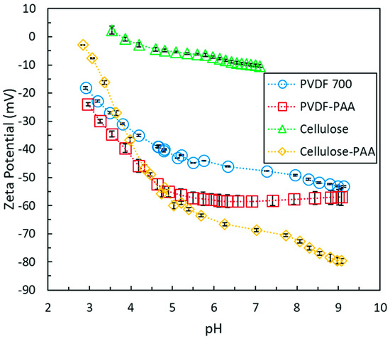 Polyacrylic acid (PAA) has many negatively charged carboxyl groups which can be utilized for pH responsive behavior, metal capture, and rejection of negatively charged ions. PAA disperses fully in the ionic liquid solvent allowing even mixing with cellulose. Entanglement with cellulose chains and hydrogen bonding with cellulose allow for the retention of PAA after phase inversion. The pKa of carboxyl groups was useful in confirming its presence of PAA at the surface of the PAA cellulose composite membranes. Zeta potential analysis (Figure 7) clearly shows that incorporating PAA into cellulose membranes results in a greater magnitude of negative surface charge that corresponds to a pKa shift at pH 3–5, as expected for carboxyl groups. This behavior has been demonstrated in our previous studies with PAA functionalized PVDF (polyvinylidene fluoride) microfiltration membranes. Due to the dissolution of PAA and cellulose together in ionic liquid, it is hypothesized that PAA was also integrated through the depth of the membrane.