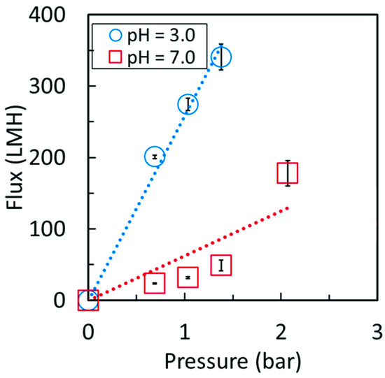 Volumetric flux of deionized water through of cellulose-PAA membrane at pH 3 and 7. Membrane surface area = 13.2 cm2.