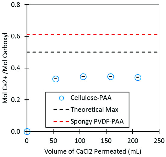 PAA has been utilized for capture of metals due to the ion exchange capacity of the vast network of carboxylic groups. Ion exchange capacity studied for this membrane using Ca2+ to better understand the quantity of PAA in the membrane and the accessibility of PAA to ions transporting through. Previous functionalized membrane platforms have not completely answered the question of whether the entirety of the hydrogel is available for ion exchange, or whether channeling occurs within the hydrogel domain. In this scenario PAA is entangled along with the cellulose composite membrane which should theoretically prevent channeling. Ca2+ adsorption is shown in Figure 9. This was not observed in cellulose membranes. likely due to the constrained environment in which the PAA is present. The cellulose-PAA membrane demonstrated a maximum Ca2+ capture of 0.27 mg, which was equal to 0.055 g Ca2+/g membrane and 0.35 mol Ca2+/mol carboxyl; this result was confirmed by a mass balance that indicated a 98.2% retention of the fed Ca2+ in either the permeate samples, the retentate, or the membrane as well as a difference of 6.6% in measured concentration between the 50 ppm calibration curve sample and the duplicate of this sample. Ca2+ capture was roughly 70% of the theoretical maximum and just over half of the 0.61 mol Ca2+/mol carboxyl that was calculated for the spongy PVDF-PAA membrane reported in literature [23]. Ca2+ capture observed in spongy PVDF-PAA membranes exceeded the theoretical value due to counter ion condensation phenomena within the membrane.