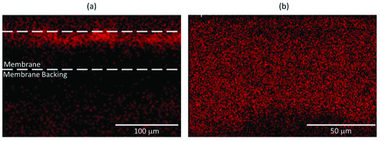 Electron dispersive x-ray spectroscopy of the PAA cellulose composite membrane was conducted to determine where metal ion capture was occurring within the membrane. The EDS mapping reveals that PAA cellulose membranes show even dispersion of divalent ions adsorbed throughout the membrane, while PAA functionalized PVDF membranes show divalent ion adsorption only toward the surface of the membrane. The EDS map (Figure 10) serves as further confirmation that PAA is evenly dispersed throughout the membrane.