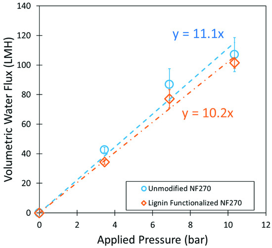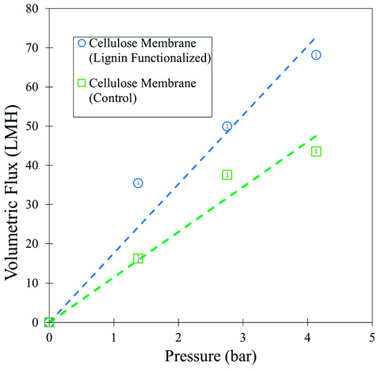 Pressure dependent volumetric water flux through cellulose membranes modified with lignin sulfonate and unmodified cellulose membranes (control).
