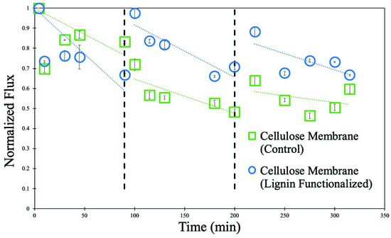 In order to characterize the fouling of a 10 wt% cellulose in IL membrane functionalized with 2 wt% lignin sulfonate, both a 10 wt% cellulose in IL membrane and a 10 wt% cellulose in IL membrane with 2 wt% lignin sulfonate (cellulose–lignin membrane) were placed in a cross-flow cell. 100 mg/L humic acid solution was passed through the cross-flow cell and the flux of both membranes was recorded over a total of 350 min. The black dotted lines indicate when both membranes were rinsed for 10 min with deionized water (pH of 5.6) to measure the effect of irreversible fouling. The normalized water flux of both the control membrane and the functionalized membrane are contained in Figure 12. The flux of both the control membrane and the flux of the membrane functionalized with lignin sulfonate decreased as more humic acid solution was passed. Error bars for each point indicate high water flux reproducibility. However, after each tangential rinse with deionized water, there is far less irreversible fouling of the functionalized membrane when compared to the control membrane. After only 10 min of rinsing, the functionalized membranes almost completely returned to the initial volumetric flux as recorded before fouling, while the control membrane shows only about 50% recovery of volumetric flux. Although the lignin sulfonate appears to have a negligible effect on the reversible fouling of the membrane, the lignin sulfonate does have a significant effect on reducing the prevalence of irreversible fouling of the functionalized membrane.