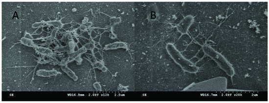 Beyond natural organic matter and proteins, a key contributor to membrane fouling are biofilms formed by microorganisms that adsorb to the membrane surface. Since, it has been understood for many years that functional phenolic groups provide antimicrobial properties in lignin, the antimicrobial properties of lignin sulfonate modified cellulose membrane was studied [28]. Lignin sulfonate modified cellulose membranes were inoculated with bacteria by filtering a dilute solution of bacteria through the membrane. The bacterial were then given dilute amounts of nutrients and allowed to grow. Bacteria colonies were analyzed after fixation to qualitatively determine the rate of production of extracellular matrix. The SEM images of the membrane surface after bacteria growth can be seen in Figure 13.