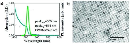 (a) Absorbance (blue continuous line) and PL (green continuous line) spectra of CsPbBr3 PNCs dispersed in hexane; and (b) TEM image of cubic CsPbBr3 PNCs. The average cube side is around 10 nm.