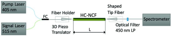 Optical gain measurements were carried out with the experimental set-up shown in Figure 2 at room temperature and ambient conditions. It consisted of two lensed fibers positioned at the input and output ends of the HC-NCF by computer-controlled XYZ piezo translators with micrometric precision. In addition, both tipped fiber couplers were placed on a rotating head with two additional degrees of freedom. A focused fiber coupler (FC) launched both pump (405 nm) and probe signal (515 nm) beams inside the input fiber, while the other fiber tip was coupled to the output end and connected to a spectrometer (Ocean Optics 2000) through a 450 nm long-pass (LP) filter to cut the pump light in the spectrometer. Intensity of the pump beam was externally controlled up to 3 µW, while probe signal intensity was reduced down to 1 nW.