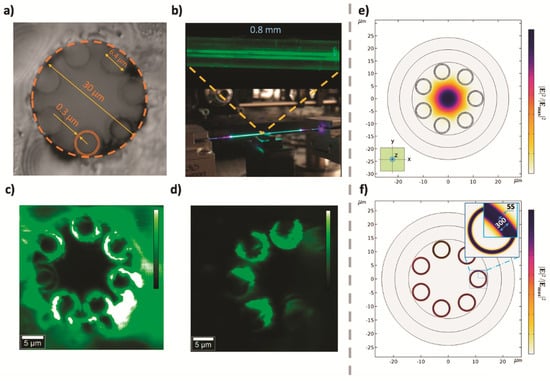 (a) Cross section of an undoped fiber taken with optical microscopy; (b) picture of the whole doped HC-NCF being pumped with the 405 nm CW laser and zoomed axial fragment (this image was registered with an optical microscope that assists the experimental setup described in Figure 2). (c,d) PL cross-section images at input and intermediate (after cleaving) faces of the HC-NCF, respectively; (e) simulation of the modal field distribution of the seven-tube HC-NCF fiber operating at a wavelength of 515 nm in the absence of PNCs. Z-axis corresponds to the propagation direction; and (f) modal field distribution of the HC-NCF doped with PNCs concentrated on the tube walls after considering a PNC layer with 55 nm thickness.