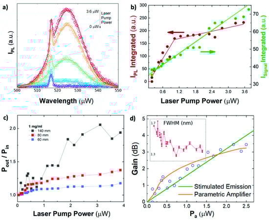 However, although an optical gain model can reproduce our experimental data, there are no physical evidences of stimulated emission in the experimental results presented here. An optical gain process through the HC-NCF should be manifested in the observation of ASE in PL spectrum under sufficiently high power pumping conditions, whose physical evidence is the collapse of the PL spectrum (around 20 nm wide) in Figure 4a into a much narrower line (below 2 nm wide) under high excitation powers, and a superliner growth of its intensity above a certain threshold [47]. Despite a slight narrowing observed in the probe signal linewidth (inset in Figure 4d), no remarkable change was observed for the main PL band by increasing laser pumping power (see Figure 4a–b), hence none of above given conditions are fulfilled. That is, the observed enhancement of the probe signal can be phenomenologically explained by a stimulated emission process, even if the pumping laser power coupled to PNCs is below the ASE threshold. Other possible gain assisted mechanisms include the superposition of the PL-beam produced by the laser pump and the probe signal or scattered light. However, the former is discarded by the deconvolution performed in the analysis of recorded spectra at the exit of the fiber, while the latter would follow a linear dependence on the laser pump power (i.e., no gain).