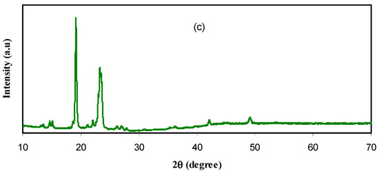 Powder X-ray diffraction (XRD) patterns for the (a) pure PEO (PEPN0), (b) PEO:CNDs (PEPN1), and (c) PEO:CNDs:Ag (PEPN2) samples.