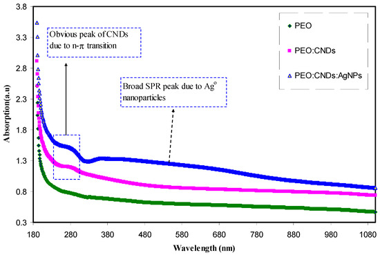 The UV–Vis absorption spectra of the pure PEO, PEO:CNDs, and PEO:CNDs:Ag composite samples.