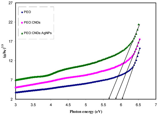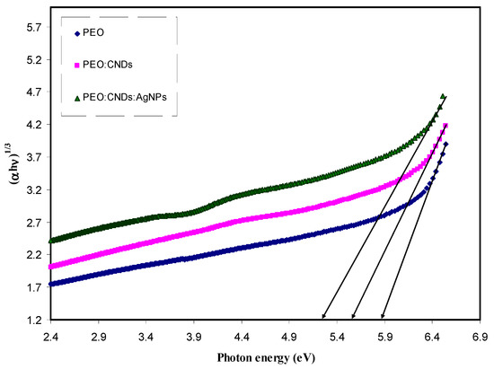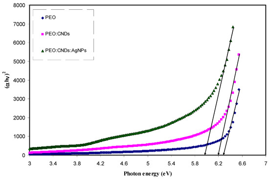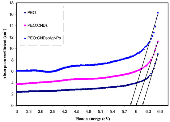 The optical properties of solid-state materials offer a valuable resource for studying energy band structure, lattice vibrations, impurity levels, localized defects, excitons, and certain magnetic excitations. A photon can excite an electron from a filled state in the valence band to an empty state in the conduction band. This process is known as an interband transition and is purely quantum mechanical in nature [62]. In this process, a photon is absorbed to produce an excited electronic state and leaving behind an “electron hole”. In later section, more insights about the electronic transition and band gap study can be grasped. The variation of the absorption coefficients as a function of photon energy for the pure PEO and PEO composite samples were obtained from absorbance measurements at room temperature as shown in Figure 6. The absorption edge values for each sample are tabulated in Table 1. It is clear from the results that the PEO absorption edge has shifted toward lower photon energy with the addition of CNDs and Ag NPs. Such shifting towards the lower photon energy indicates that the optical band gap energy for the doped samples has been decreased [63].
