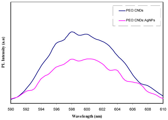 Figure 7 shows the photoluminescence (PL) spectra at excitation wavelength of 300 nm for PEO:CNDs and PEO:CNDs:Ag composites samples. It can be seen that PL emission of PEO:CNDs composites are more intense than that of PEO:CNDs incorporated with Ag NPs. It is obvious that the PL spectrum of PEO:CNDs:Ag system was decreased. The prepared Ag NPs display photoluminescence as a result of electron excitation from occupied d-bands into unoccupied states above the Fermi level. Subsequent relaxation through electron–phonon- and hole–phonon-scattering processes result in an energy loss and, consequently, photoluminescent radiative recombination of an electron from an occupied sp band with the hole occurs [64]. The characteristic PL band in both PEO:CNDs and PEO:CNDs:Ag composites was observed to be broad. Other researchers have also demonstrated a broad-band emission characteristic for dyes doped with silver NPs at ~520–600 nm [65]. Yeshchenko et al., [66], noticed that the PL total intensity can be greatly decreased by increasing temperature, indicating a strong dependence of the PL quantum yield of Ag NPs on temperature. On the other hand, in recent years, the enhancement of PL characteristics has been studied for dye and complex molecules in accordance with surface plasmon excitation based on metal nanoparticles [65]. There is a growing literature on the study of optical and electronic properties of silver nanostructures, in particular of Ag NPs. The luminescence of silver and noble metals is usually based on transitions of electrons between the upper d-band and conduction sp-band. The luminescence of silver metal can be induced by illuminating the metal (or film) surface with a beam of photon, electron or laser beam. The position of the luminescence emission peaks has been reported to be distributed over a wide range of wavelength, from 320 to 520 nm. The plasmon absorption peak at around 400 nm and above is known to be characteristic of nano-sized silver particles [67]. The visible luminescence from Ag NPs has been reported earlier and ascribed to the excitation of electrons from occupied d-bands into unoccupied states above the Fermi level [68]. Based on SPR excitation, the decrease of PL intensity can be interpreted. It is well reported that the enhancement of the PL is associated with the SPR excitation [29]. Therefore, the decrease in SPR peak intensity gives rise to weak PL spectra. The results of PL study are completely in agreement with the results of UV–Vis absorption study. From the UV–Vis spectra of Figure 3, it was observed that the surface plasmonic resonance of Ag NPs is well broadened. It can be established that this broadening is responsible for the reduction of intensity of PL spectra for the sample incorporated with Ag NPs.