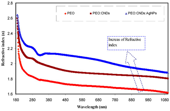 From Equations (3) and (4), one can clearly compute R from the values of A and T, i.e., using , whereas the value of T can be obtained by use of Beer’s law (i.e., ). Figure 8 shows the refractive index spectra of the pure PEO, PEO:CNDs, and PEO:CNDs:Ag samples. It is clear that, with increasing CNDs and Ag NPs, the refractive index has been increased. Recently, it is noted that the necessity for high optical refractive index materials in device applications is increasing, such as in applications of filters, ophthalmic lenses, highly reflective and antireflective coatings, optical adhesives and advanced optoelectric fabrications [70]. Jin et al., [71], reported that the refractive index of PMMA can be increased from 1.49 to 1.839 by adding 20 wt % of TiO2, which is lower than that obtained in our work for PEO incorporated with CNDs and Ag NPs.