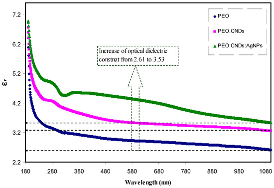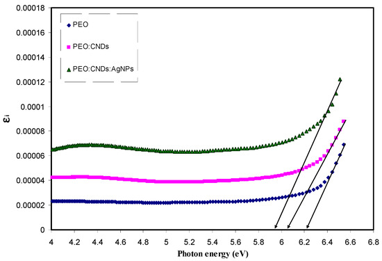 Therefore, it is clear from Equation (7) that the optical dielectric loss, i.e., , is correlated with the band structure () of the material. Through using a few simple equations, the complex dielectric function, which is related to other measurable optical parameters, such as refractive index and extinction coefficient, can be calculated. Figure 13 shows the optical dielectric loss versus the applied photon energy for all the samples. For all the samples, clear linear parts can be noted. Previous studies confirmed that the linear parts in spectra are closely associated with the inter-band transitions [2,7,11,12,33]. Therefore, the intercept of linear parts (see Figure 13) with the photon energy axis can be regarded as the real band gap. Then, by comparing the plots obtained from Tauc’s equation (see Figure 9, Figure 10, Figure 11 and Figure 12) to Figure 13 of optical dielectric loss, the types of electronic transition can be identified. It is possible to conclude that the type of electronic transition in pure PEO and PEO:CND:Ag samples are direct allowed, while for the PEO:CNDs sample, the transition is mainly indirect allowed. Therefore, optical dielectric function can be a useful tool to study the band gap structure for solid materials. The decrease of band gap (see Table 2) is related to the increase density of states upon addition of CNDs and Ag NPs to the PEO host polymer. This can be more understood through the study of optical dielectric constant. To a large extent, there is evidence that optical dielectric constant () parameter is related to the density of states, which directly related to the localized electronic states in the forbidden gap of materials [2,6]:
