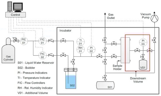 Single-gas permeability in humid conditions of the fabricated films was evaluated for two gases, CO2 and N2. Before testing, the samples were prepared by cutting them in a circular shape and masking the outer part with aluminum tape sealed with epoxy resin. This was done to avoid direct compression of the film by the rubber O-ring utilized to ensure a good seal in the sample holder. The apparatus used for this purpose, the layout of which is presented in Figure 2, had a set-up incorporating a fixed volume, variable pressure, and a humid permeometer.