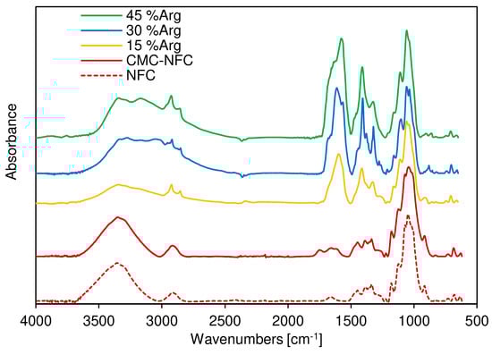 FTIR spectra of the CMC-NFC/arginine blends were also acquired in order to assess the presence of the amino acid within the polymeric matrix. A new peak was first encountered at 3151 cm−1, related to the stretching of the N–H bond which extended and partially overlapped with the O–H stretching band. The resulting broad peak suggested the presence of an extensive hydrogen bonding network in the blend. Another significant indication of the growing presence of l-arginine was determined by the sharp peak at 1590 cm−1, which was due to the out-of-plane bending of the N–H group, and the series of peaks between 1420 and 1320 cm−1 could be related to the symmetrical bending of the CH3 group, as suggested by Kumar et al. [].