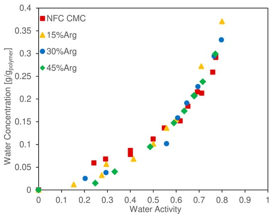 All the isothermal sorption curves are collected in Figure 7, which presents the water uptake expressed with respect to the dry weight of the film as a function of water activity. From a first view of the data, no significant difference can be outlined when the content of amino acid was incremented in the film. This shows that the water uptake of the nanocellulose/arginine blend does not seem to depend on the ratio between the two components, even if some difference can be observed in the general behavior. In particular, up to an activity of 0.5 and an uptake of about 0.1 g/gpol, the water concentration increased with an approximately linear slope with pure NFC films, showing higher water uptake and a positive intercept of the linear trend with respect to the loaded samples. From this point onward, the slope of the isothermal curve changed, acquiring a more exponential trend. Values here ranged between 0.15 g/gpol at an activity of 0.60, up to 0.33 g/gpol at 0.79, and all curves were superimposed with no differences visible among different materials. This dual trend was already observed in previous works on vapor sorption in NFC [,], and it was explained by a first phase controlled by the adsorption of water onto the polar moieties of the fibers, followed by a second phase commonly linked to water clustering [,] and film swelling, which is also related to the adsorption of a subsequent layer of water molecules onto the first one, exponentially increasing the uptake of water.