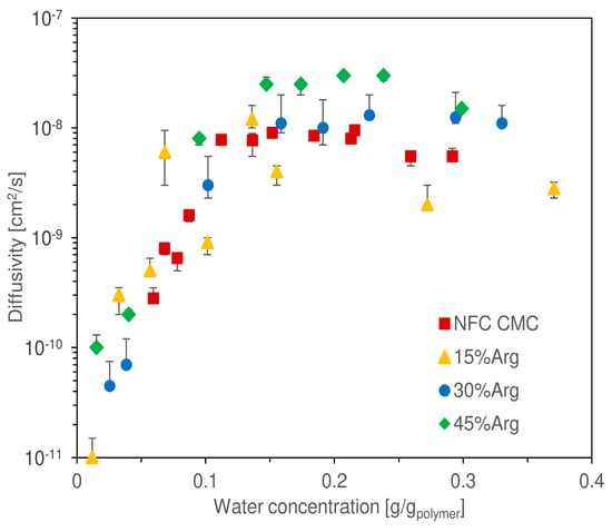 In this part of the chart, it could be argued that the different samples tended to reach a plateau at different asymptotic values, for the film with 45 wt.% Arginine occupied the top place at 3 × 10−8 cm2/s; however, due to the data scattering, high experimental uncertainty was associated with different data. Thus, a final conclusion on the presence of a trend in the asymptotic diffusivity cannot be given without a deeper analysis, which is outside the scope of the present work.