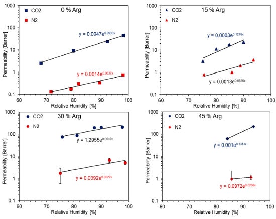 Ideal selectivity was calculated as the ratio between permeability of CO2 and N2 measured at the same relative humidity. Since RH values differed slightly between points taken for the two gases, an interpolation was adopted. Standard humidity levels were fixed, and the respective permeability values were calculated assuming an exponential trend (), which for sake of clarity is reported in Figure 9 together with the equation used for calculations.